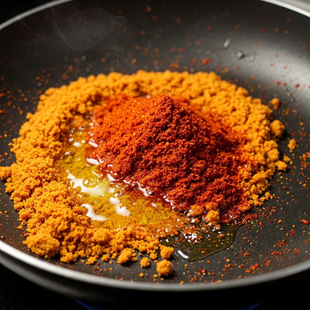 Now add one tablespoon of oil in a pan. Then add 1-2 tablespoon of besan and roast until golden brown. Now add kashmeeri red chili powder and roast it again at low flame for 1-2 minutes.
